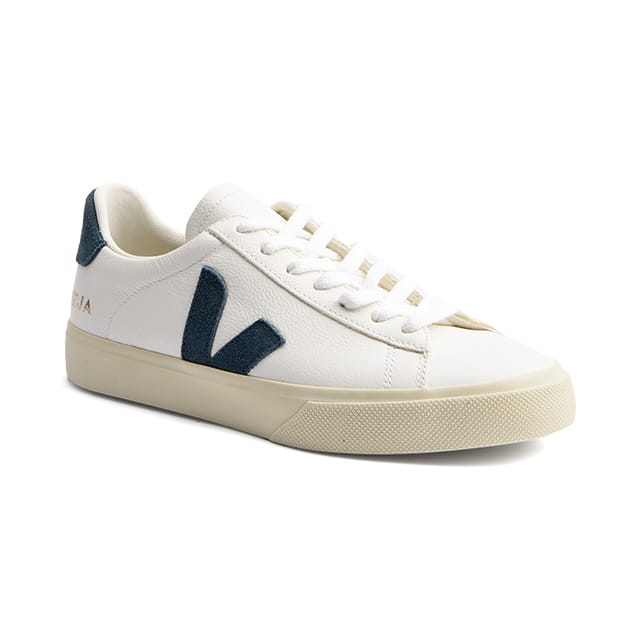The sneakers Veja CAMPO are fashion and comfort shoes designed for everyday. Made in Brazil ethically and ecologically, they combine a white leather top with contrasting navy blue accents. Their classic design, with flat laces and a lace closure, gives them an elegant look. Brand details, such as the "V" logo on the side and the logo near the back part, add a personal touch. The beige synthetic soles, with textured details, offer a combination of style and functionality. The Veja CAMPO shoes are ideal for everyday outings, hiking or leisure, as they offer comfort and versatility without compromise. -