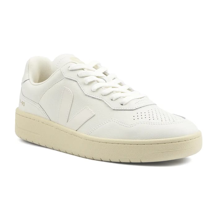 The Veja V-90 are white leather sneakers that combine fashion and comfort. Designed for the days ahead, these shoes are ideal for everyday use, whether you're on the go, on leisure or just in style. Their low design is stylish and versatile, while their quality leather ensures exceptional durability. The V-90s feature a removable textile lining, textile insole and rubber outsole, providing optimal comfort while remaining lightweight. The perforations on the front of the shoe ensure optimal ventilation, while brand details near the back add a touch of sophistication. The flat laces and subtle stitching on the sides of the shoe complement its elegant design. The V-90s are a great option for those looking to stand out from current fashion while remaining comfortable and versatile. -