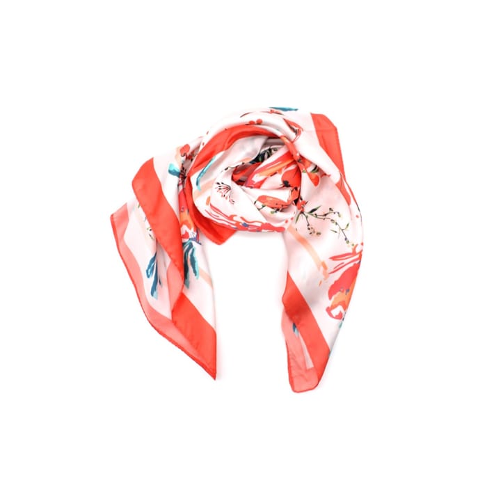 This Vimoda 19177 scarf combines elegance and practicality to sublimate your winter style. Designed in silk fabric of exceptional softness, it is adorned with a vibrant floral pattern where shades of deep red, sunny orange, deep blue and pure white blend. The stylized flowers and leaves, placed on a mainly white background, are enhanced by bold diagonal stripes in coral or bright pink at the ends, bringing a touch of dynamism to the whole. Lightweight and slightly translucent, this scarf embodies both refinement and comfort, while offering protection from the cold. Perfect to dress up a winter outfit with sophistication or to add a touch of warmth and style to your daily life. -