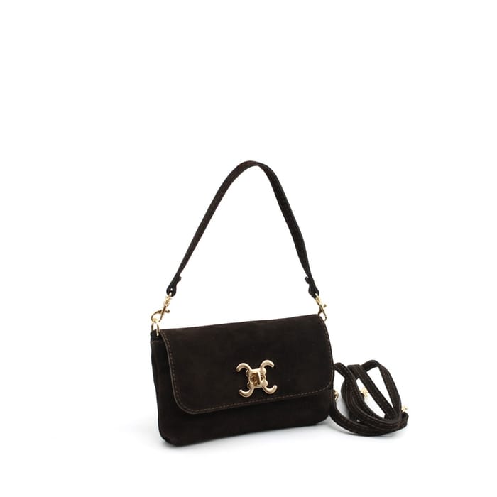 The Vimoda 390411 flap bag combines elegance and practicality in a classic design. Its dark brown suede finish brings a stylish twist, while the golden hook closure adorned with an interlaced pattern adds a distinctive note. Supported shoulder, it adapts as well to the office as to outputs or everyday thanks to its adjustable and removable shoulder strap length. The interior offers organized storage with several compartments, including a zipped pocket and open spaces, ensuring safety and accessibility. This bag combines functionality and style for an elegant outfit in all circumstances. -