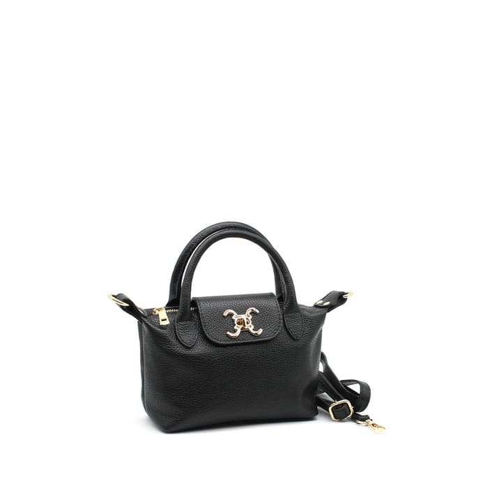 The Vimoda 390428 handbag combines timeless elegance with stylish practicality to fit any occasion. Designed in quality black leather, this model stands out for its chic design, marked by a textured and grained surface that imparts a sophisticated touch. The golden metal details, such as the elegant flap closure and the decorative lettering-like emblem "H", bring a luxurious and subtle note. Ideal for everyday use as well as for events, this versatile bag can be worn with ease thanks to its two main handles, perfect for a grip or a passage on the forearm. A detachable strap also allows to carry it across the shoulder for more comfort. Its functional appearance combines style and storage, with multiple compartments secured by discreet zippers, thus offering an optimal organization for your essentials. An essential accessory for those looking for both discretion and distinction. -
