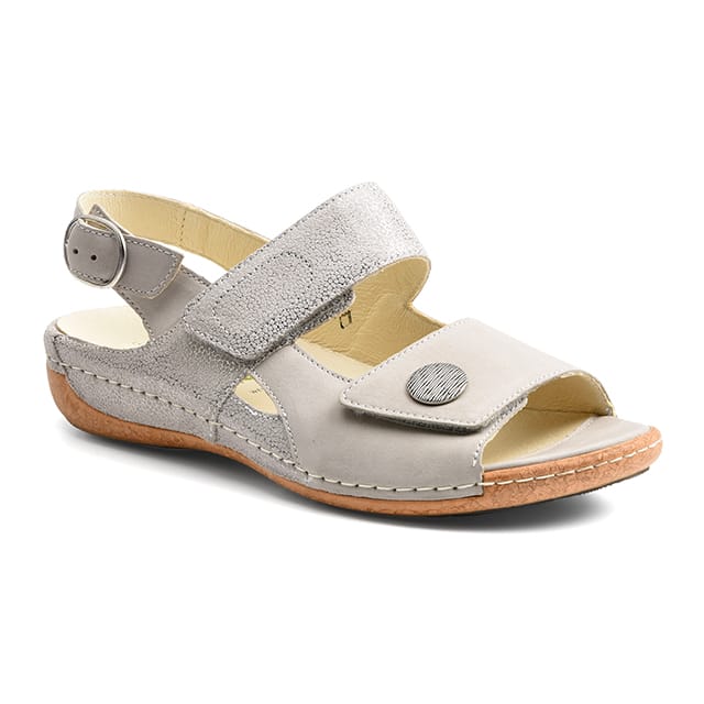 The Waldlaufer Heliette 25 sandals are designed for casual and summer wear. Made of nubuck leather, they offer exceptional comfort and breathability. Their leather insole is removable, making maintenance easier. The synthetic outsole ensures durability. The heel measures 35 mm, offering optimal lightness and flexibility. The Heliette 25 sandals are ideal for everyday occasions, holidays or a day at the beach. Their casual design and grey color make them perfect for a summery look. -