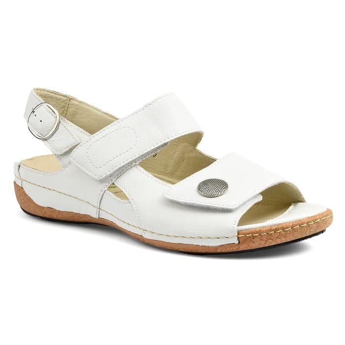 Discover the Heliette 25, flat sandals of the brand Waldlaufer. Designed for casual wear, these sandals are ideal for holidays, the beach or summer days. Their leather upper and upper offer a feeling of comfort and lightness, while the leather lining ensures extra softness. The leather insole is also soft and flexible. The synthetic outsole offers strength and durability. The two adjustable straps, one on the instep and the other on the heel, allow to adapt to your foot. The strap on the instep is equipped with a decorative button near the foot and a metal clasp for secure attachment around the foot joint. The heel measures 35 mm and offers a reasonable heel height. The Heliette 25 are available in white, an ideal color for the summer. -